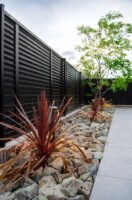 建物のシャープな外観に呼応して、素材と植栽のレイヤーによるエクステリアを構成しました。